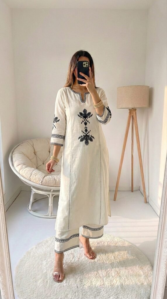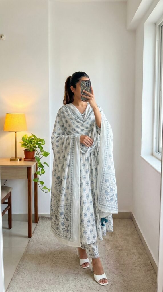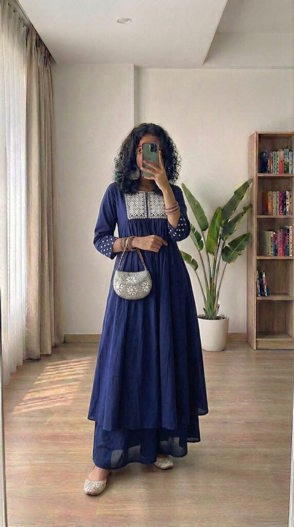 - Footwear carries enormous weight. Tan kolhapuris for casual class days, block heels or pointed mules for office settings, embellished flats for college events — the same kurta set says three very different things depending on what’s on your feet.