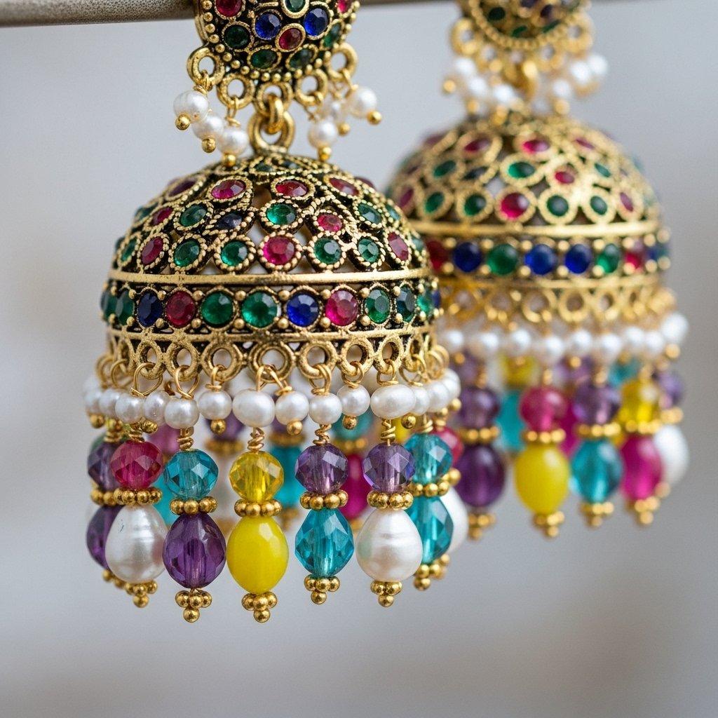 - Pair multicolor jhumkas with simple kurtas or solid sarees.