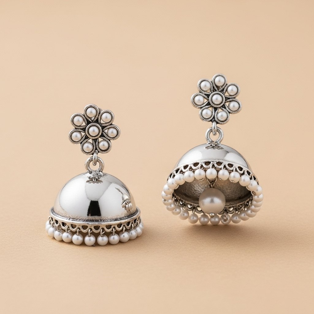 These petite silver-pink jhumkas are ideal for daily wear or simple pujas. Their elegant shine complements light ethnic attire effortlessly.