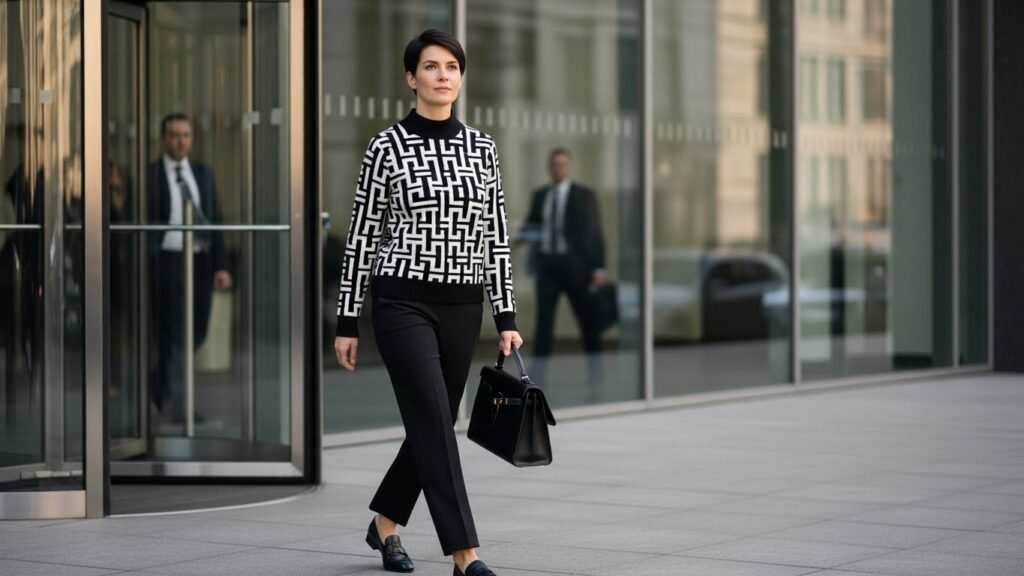 Turtle necks, mock necks और geometric या solid neutral sweaters office‑friendly होते हैं । Beige knitted pullovers और black‑white geometric patterns especially formal और classy दिखते हैं, खासकर trousers या neat jeans के साथ ।