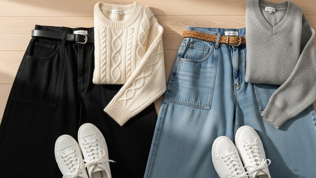 Sweaters तभी shine करते हैं जब उनके साथ सही jeans हों। इस haul में दो jeans H&M से ली गई हैं – एक black और एक faded blue wide‑leg ।
