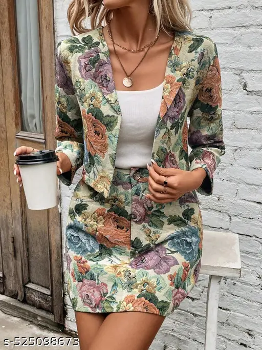 This set combines a structured beige coat with an orange printed skirt, ideal for summer outings. The coat features padded shoulders for a polished silhouette, while the skirt’s elastic waist ensures comfort.