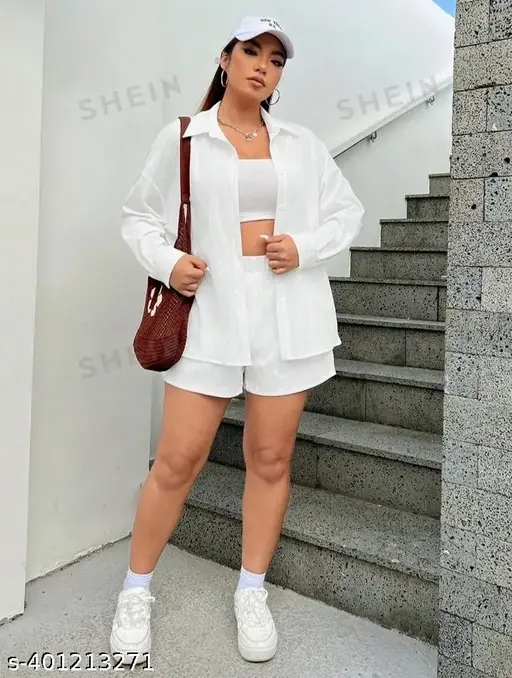 This crisp white shirt and shorts combo is perfect for brunches or picnics. The shorts feature a hidden elastic waistband for comfort.