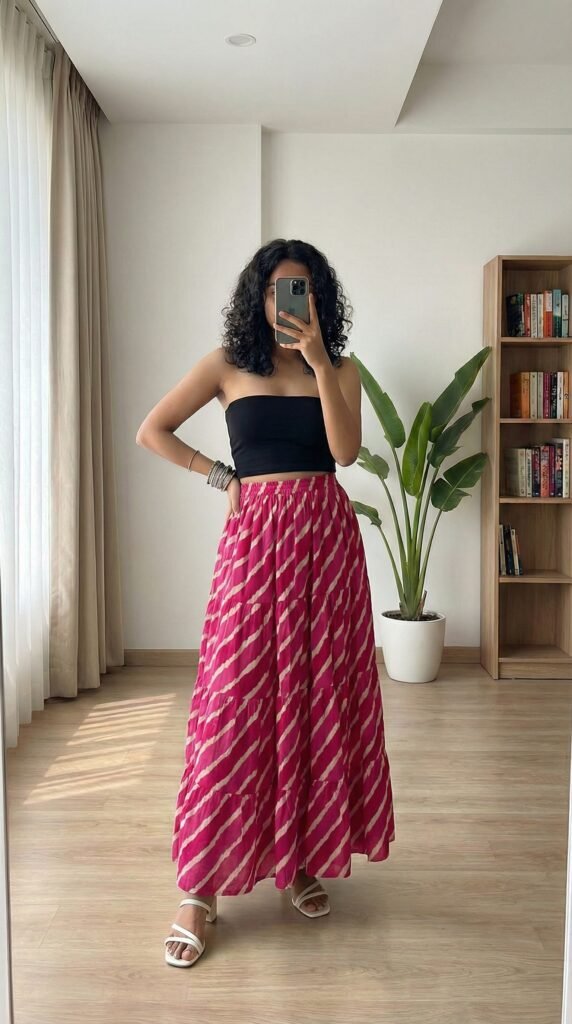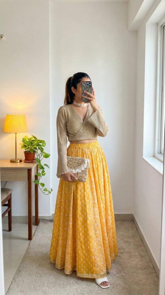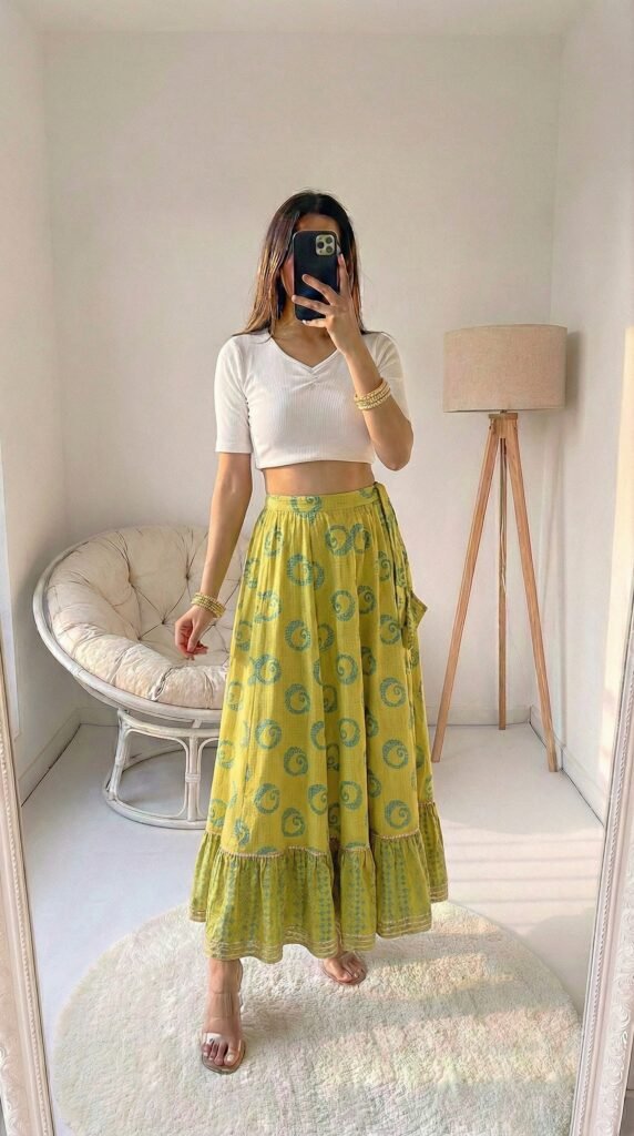 - Let your footwear complete the story. Kolhapuris for ethnic, sneakers for casual, block heels for dates, flat sandals for everything else. The shoe choice changes the entire mood of the same skirt.