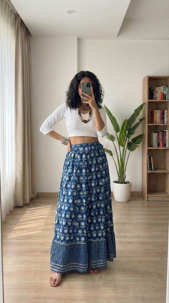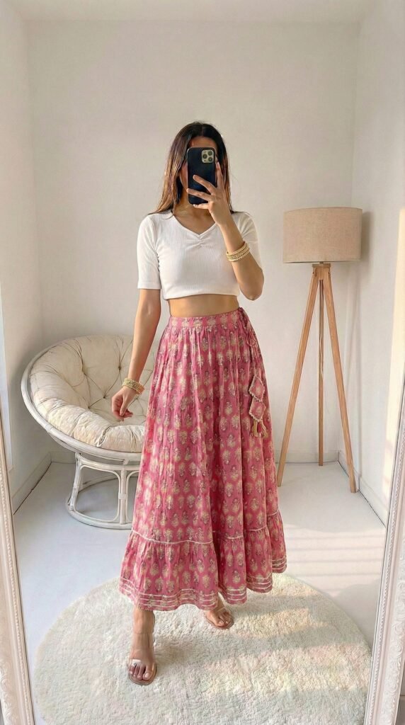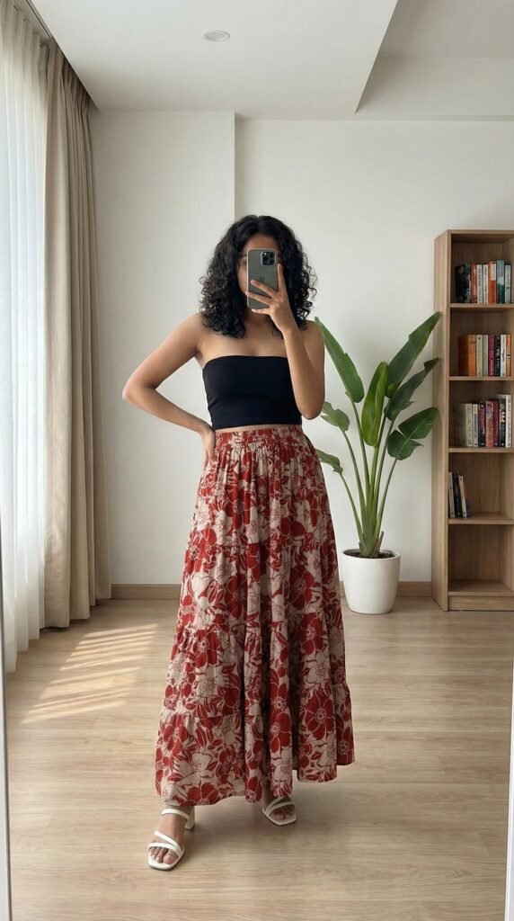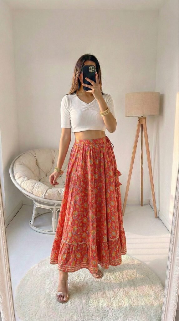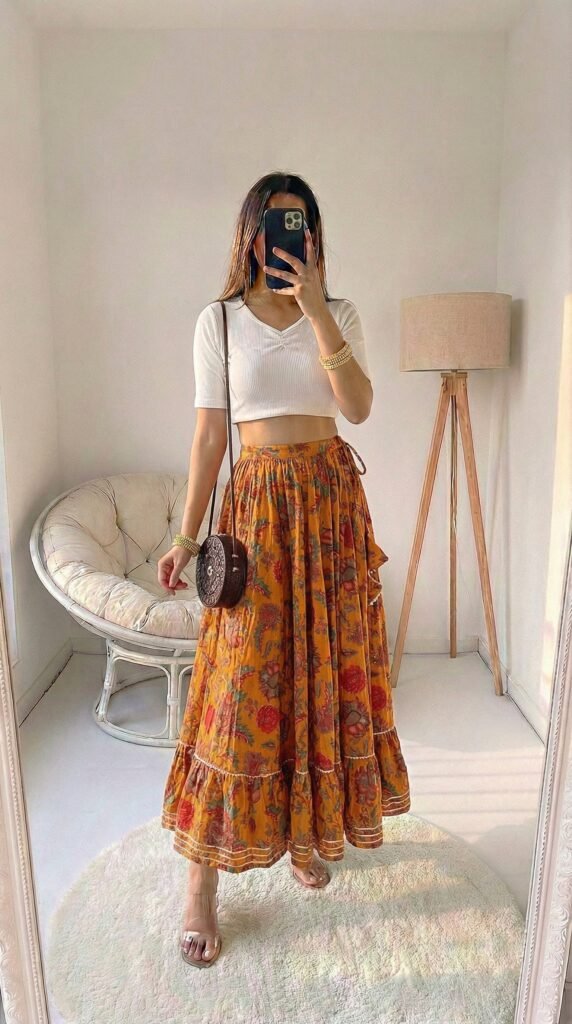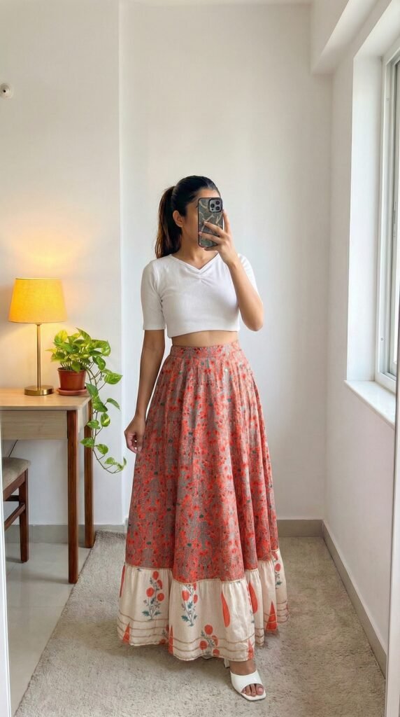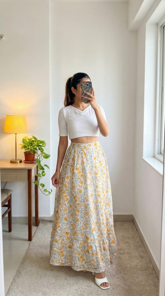 The genius of a floral maxi is in its built-in confidence. You don’t need much else — the print is your statement, the flare is your drama, the cotton is your comfort. Styling expert wisdom consistently points to one truth: when your skirt is the hero, your top becomes the supporting actor — and a soft, solid-colour crop top in a tone pulled from the print is always the perfect supporting role. What I’d tell you is to resist the urge to over-accessorise this one. Two thin gold hoops, one delicate ring, and you’re done. The skirt knows exactly what it’s doing. Trust it.