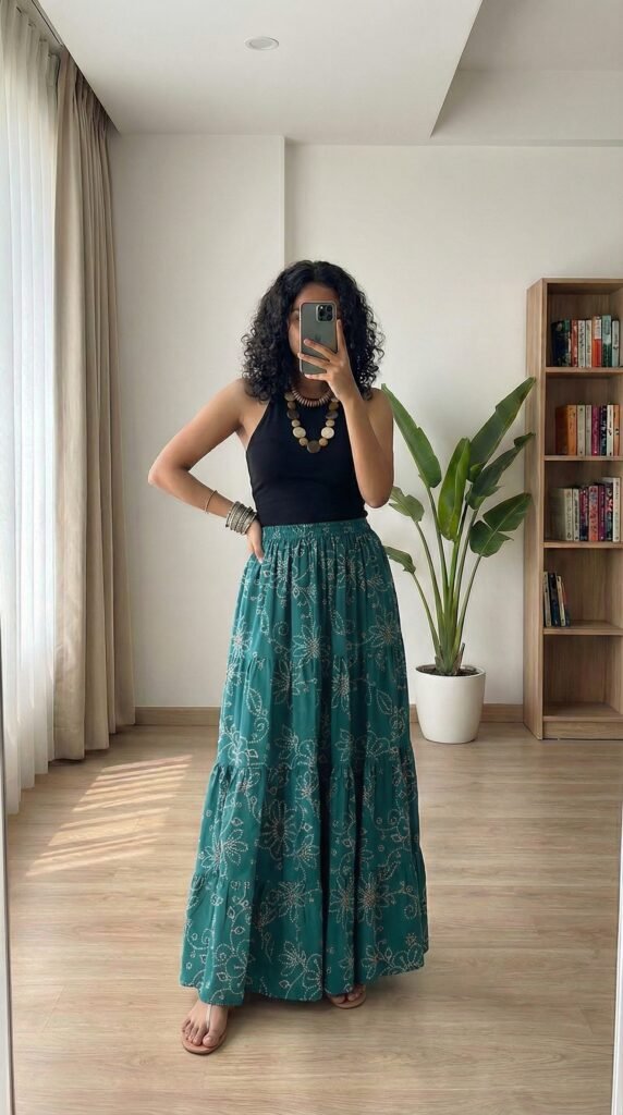 Who says cotton can’t be festive? In 2026, pure cotton printed maxi skirts have become the go-to for Indian women who want to look dressed up without melting in the summer heat. The third CHARMANT Printed Flared Maxi Skirt in our lineup is the one you wear to family get-togethers, Navratri evenings, or those casual puja lunches at your aunt’s house where you want to look gorgeous but also be able to sit on the floor, eat three rounds of kheer, and still feel comfortable. Style it with a bandhani-style printed mirror-work blouse in a complementary colour — rust, gold, or ivory — and let the two prints have a happy, festive conversation.
